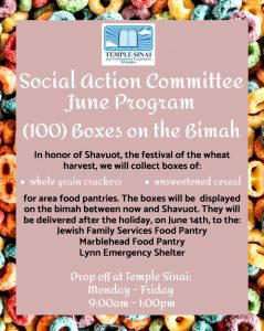 This June, add to the many Boxes on the Bima to provide food to three homeless shelters. In honor of Shavuot, the festival of the wheat harvest, Temple Sinai annually collects 100 or more boxes of whole grain crackers and unsweetened cereal to be deliver on June 14. Please drop boxes off at Temple Sinai Monday through Friday, 9:00am – 1:00pm or bring them to the temple when you come for meetings and events! Questions? Email susan.templesinai@gmail.com or call the office at 781-631-2763. Thank you in advance!