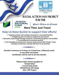 Help Temple Sinai’s Social Action Committee to raise $3,600 or more in support of Jewish National Fund USA’s efforts to provide housing for families displaced by the October 7 war. Money raised will also be used to supply fire fighting and civil defense system needs and for many other important activities. Certificates will be sent to all that donate, and you can dedicate a donation in honor of loved ones, a lifecycle event or any other occasion. Make checks payable to Temple Sinai and bring them to the office or mail then to Temple Sinai, One community Road, Marblehead, MA 01945, Attn: JNF Project. Questions? Email susan.templesinai@gmail.com