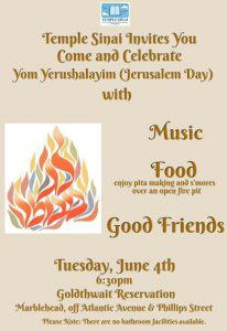 Come join us as we celebrate Jerusalem day with an open fire pit, cook-your-own pitas and s’mores while you chat with friends! This annual event takes place at Goldthwait Reservation in Marblehead, off of Atlantic Avenue and Phillips Street. There is plenty of street parking but please note, there are no bathroom facilities at the Reservation. Reservations not required. Questions? Email susan.templesinai@gmail.com